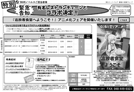 「追放者食堂へようこそ!」アニメ化フェア注文書 2025.5.15 ノベルス コミックス 【ガルド】「追放者食堂へようこそ!」アニメ化フェア注文書 1 file(s) 853.47 KB Download 【ノベルス】「追放者食堂へようこそ!」アニメ化フェア注文書 1 file(s) 851.77 KB Download